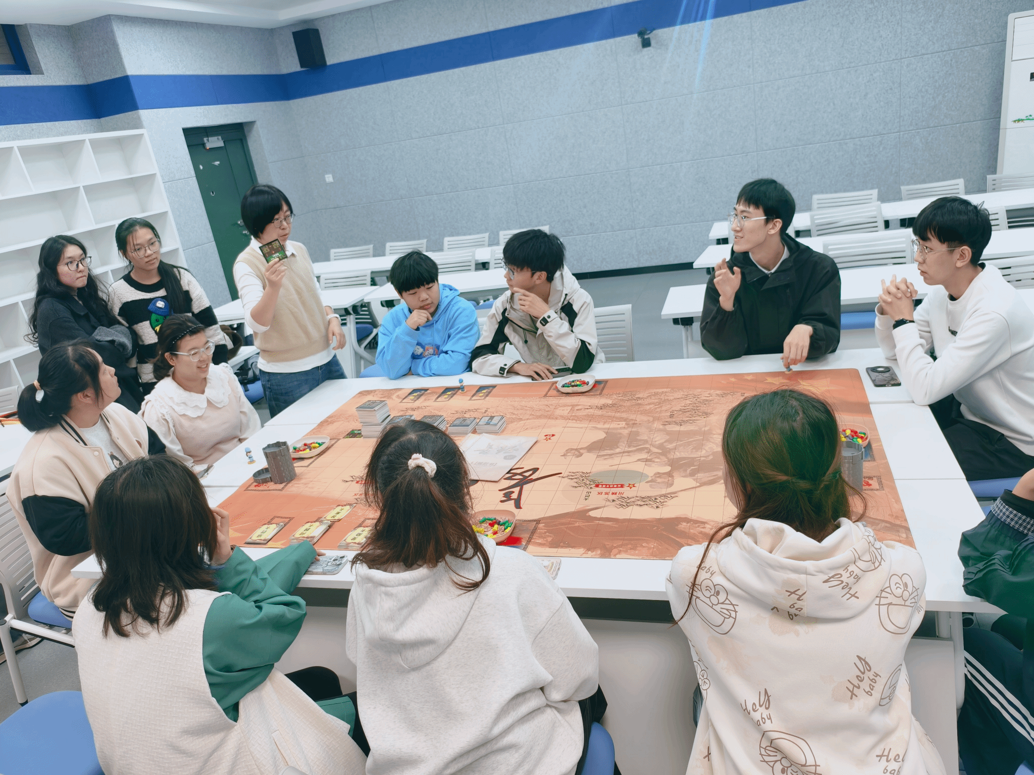 理论宣讲环节结束后,活动进入了别开生面的“长征主题桌游”体验环节。此环节旨在通过沉浸式、互动性的方式,让同学们更直观地感受长征的艰辛与伟大。参与者被分为若干小组,在模拟长征路线与情境的地图上,共同应对“爬雪山”、“过草地”、“突破封锁线”等重重挑战。游戏中,同学们需要运用策略、团结协作,深刻体会当年红军战士所面临的重重困难与展现出的超凡智慧、坚定意志和革命乐观主义精神。现场气氛热烈,同学们在寓教于乐的体验中,对长征历史有了更为具象化的理解,对长征精神的内涵有了更为深刻的感悟。