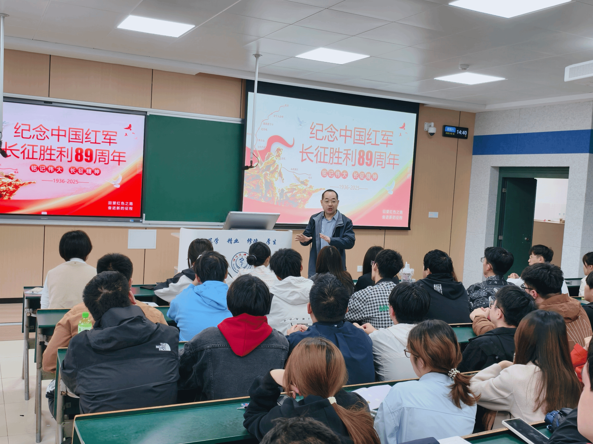 近代史纲要教研室的李乐老师为同学们带来了一场题为“长征精神永放光芒”的精彩宣讲。李老师以深厚的理论功底和生动的历史叙事,深情回顾了红军长征那段波澜壮阔的辉煌历程,阐述了坚定信念、艰苦奋斗、一往无前、不怕牺牲的伟大长征精神的丰富内涵与时代价值。他特别强调,长征精神对于当代大学生坚定理想信念、激发爱国热情具有重要的教育意义。他鼓励同学们要从中汲取精神滋养和前进的动力,将个人理想融入国家发展伟业,走好新时代的长征路。